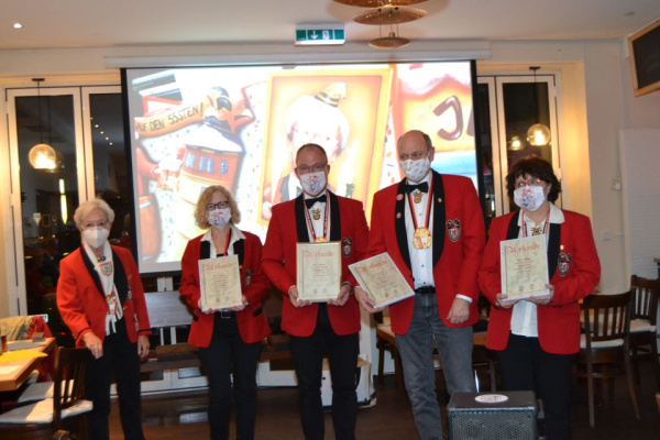 Am 30.10.2020 haben wir unsere Ordensverleihung unter den besonderen Bedingungen des Infektionsschutzes durchgeführt. Schon lange im Vorfeld haben wir uns eine Lokation ausgesucht, die alle Voraussetzungen für eine hygienische Ordensverleihung erfüllt. Die Regel AHA – Abstand, Hygiene, Alltagsmaske – konnte aufgrund der Größe des Raumes von allen Beteiligten eingehalten und es war trotzdem war es ein sehr stimmungsvoller Abend. Alle waren sich einig, auch mit Abstand kann man einen Ordensabend, der ja ohnehin keine Party ist, sehr stimmungsvoll und sicher verbringen. Der Orden wurde nicht umgehängt, sondern auf einem Kissen präsentiert und jedes Mitglied konnte ihn sich nehmen und ausnahmsweise selbst umhängen. Das obligatorische Bützchen gab es dann mit Abstand als „Luft-Kuss“.