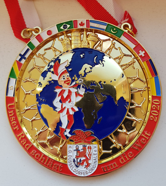 Im Anschluss an die Ehrung, weitere werden folgen, wurde unser neuer Orden präsentiert. Das Düsseldorfer Motto „Unser Rad schlägt um die Welt“ wird hier mit einem sich drehenden Ring mit Radschlägern dargestellt. Im Zentrum des Ordens, um den sich die Radschläger drehen lassen, befindet sich eine Weltkarte mit dem Hoppeditz, der auf einen Brillanten zeigt, der wiederum die Position Düsseldorfs zeigt.