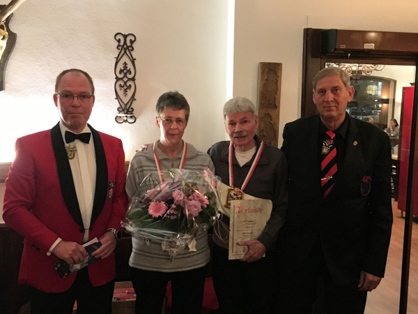 Ebenfalls zur Ordensverleihung werden unsere verdienten und langjährigen Mitglieder geehrt. In diesem Jahr feiern Ulrike Römer und Hans Börgens 1 x 11 Jahre Mitgliedschaft. In seiner Laudatio ließ Guido wichtige Ereignisse aus den Geburtsjahren der beiden Jubilare Revue passieren.